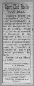 “Esteve bastante concorrida a festa de inauguração deste club, comparecendo crescido número de senhoritas e cavalheiros. Constou o festival de uma partida de football em que tomaram parte sócios do Sport Club e do English Eleven. A partida foi bem jogada de ambas as partes, havendo um empate. Felicitamos a diretoria do Sport Club pela vitória alcançada, pois sendo uma sociedade nova, não se deixou vencer pelo English Eleven”. Diario de Pernambuco (24/6/1905).